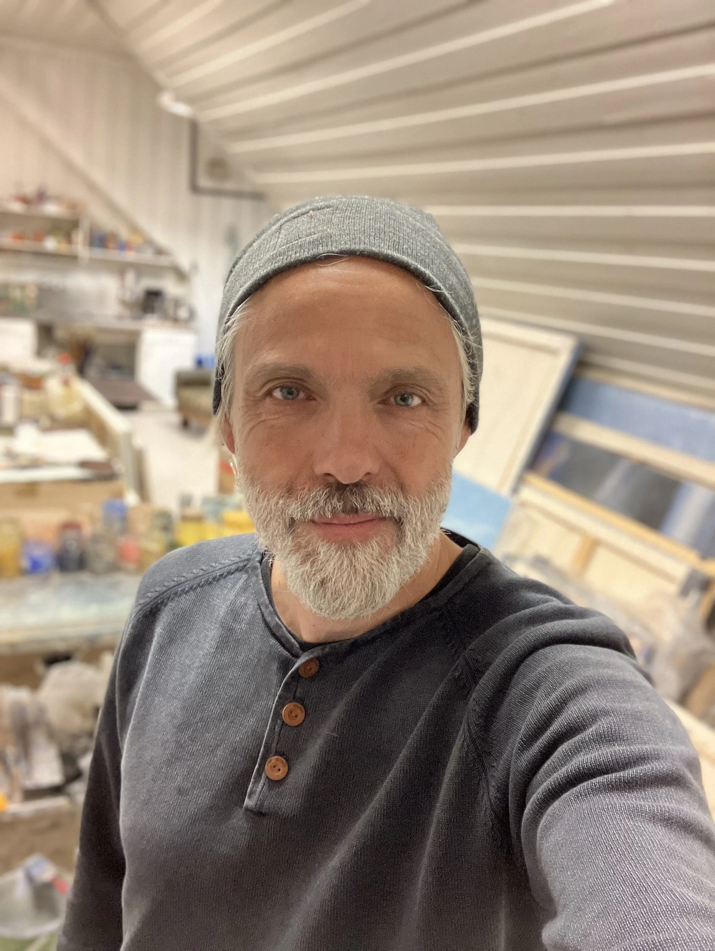 – Han har alltid vært inspirert av Munch, men studerte og bodde en tid i England, og ble inspirert av BritPop. Flyttet etterhvert tilbake til Oslo, hvor han bodde og arbeidet på et atelier midt på Grensen i sentrum. Det ble mye bylandskap.. Hadde en utstilling med tittel “Cityescape” hvor det urbane landskapet var fremtredende, men der viste han for første gang mer horisont imellom asfalt og betong - det skapte en nysjerrighet. Etterhvert ble bygg og gater mer gjennomsiktige og det ble byggeplasser og stålkonstruksjoner mot himmel og landskap bak og igjennom. Byen ble øde og forfalt mens landet bak vokste seg sterkt og tok over horisonten. I dag er det vidsynet, den omsluttende himmelen som vektes i maleriene. Han er glad i opplevelsen av det store åpne landskapet.